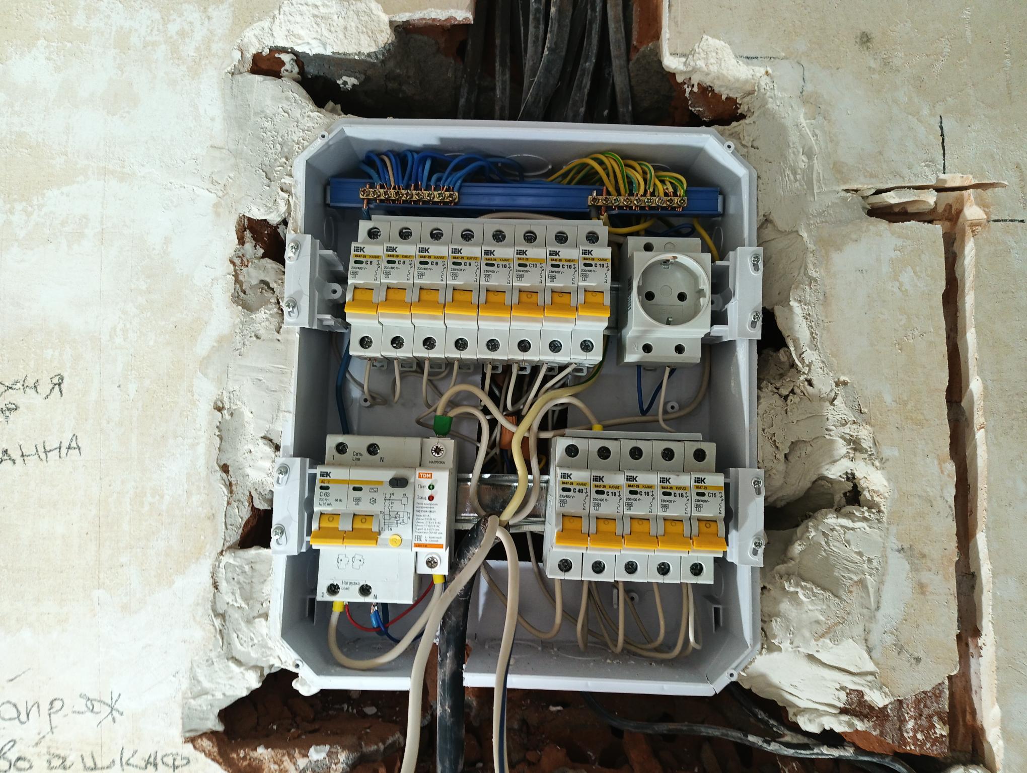 - установка приборов освещения, автоматов, УЗО, реле контроля напряжения;