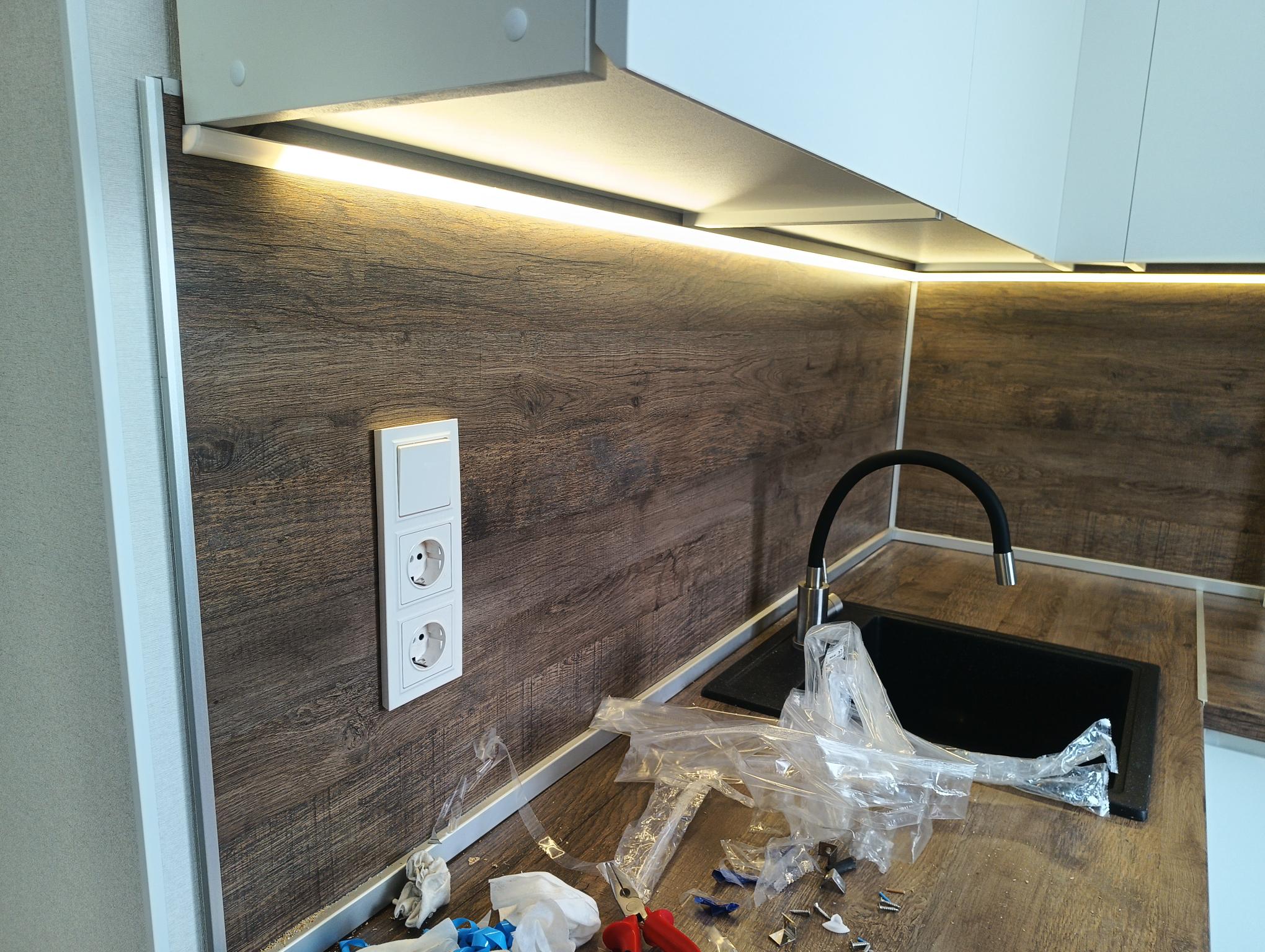 Вызвать электрика на дом в Уфе установить розетки и выключатели на кухне, сделать монтаж светодиодной ленты на кухонном гарнитуре.