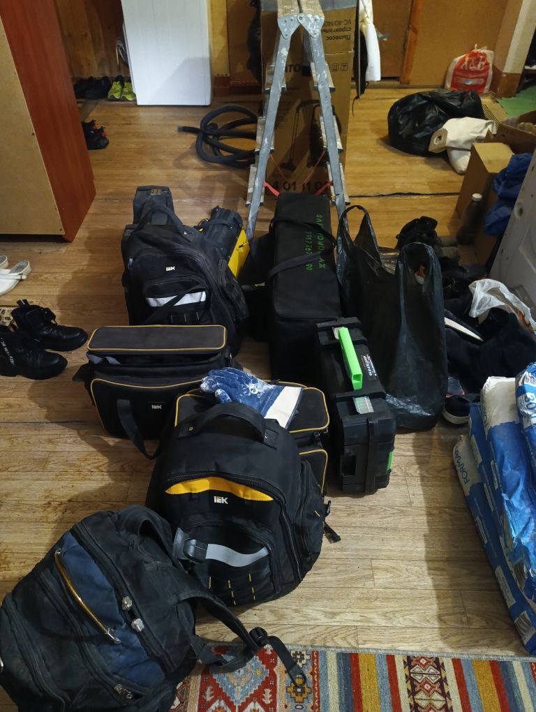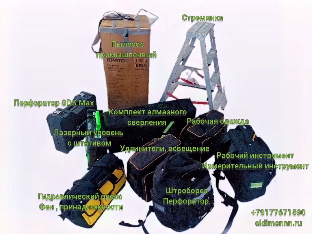 Что можно сказать и какие выводы можно сделать по этому поводу. На данный момент, одним перфоратором не обойтись. Как минимум нужно с собой на замену электропроводки в квартире или добавить розетки в кухне везти такое количество инструментов и это минимум. В Сталинку с большими потолками нужно брать ещё лестницу соответствующую. Вот на картинке перечислим и добавлю фото с заявки.